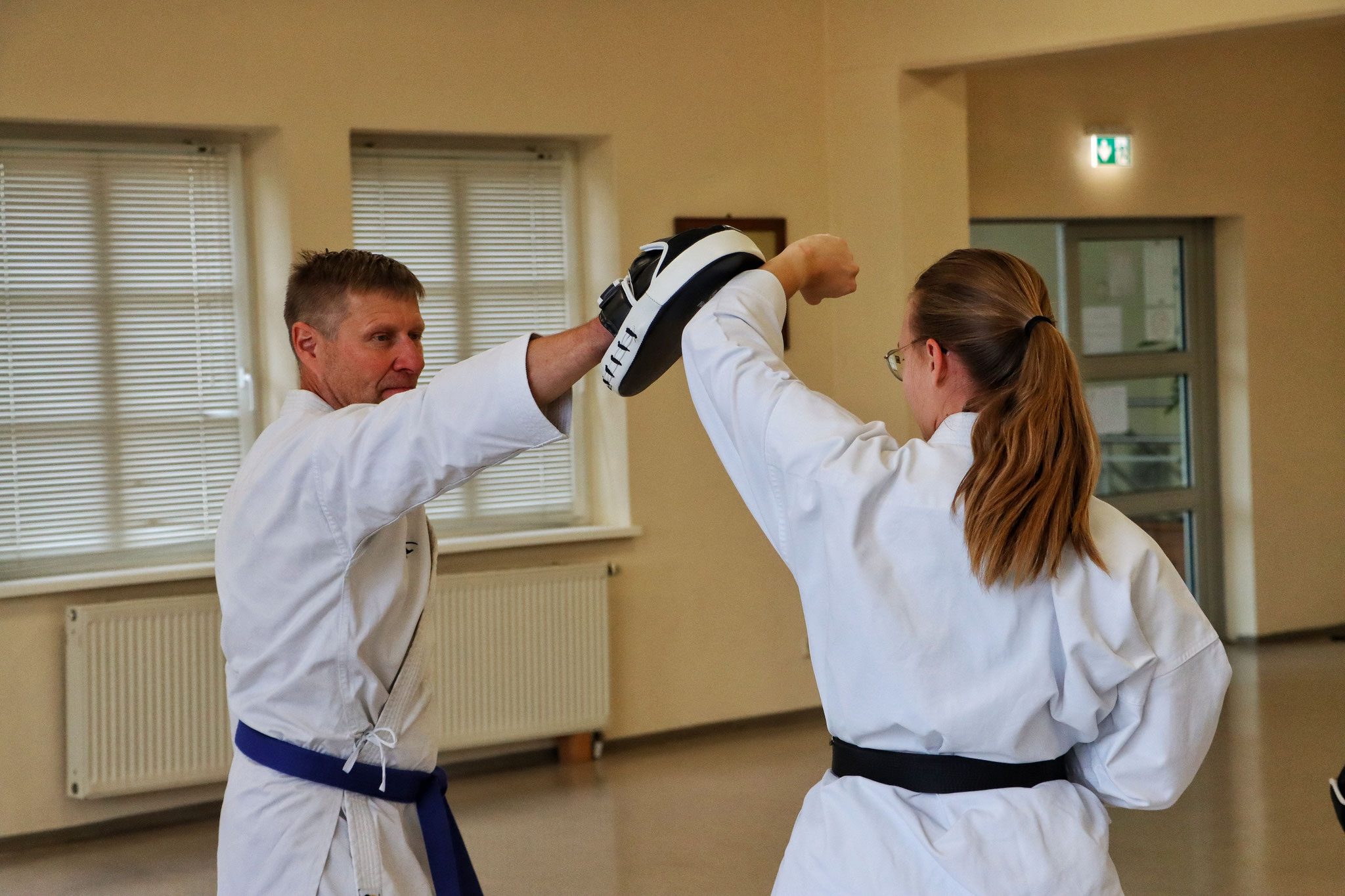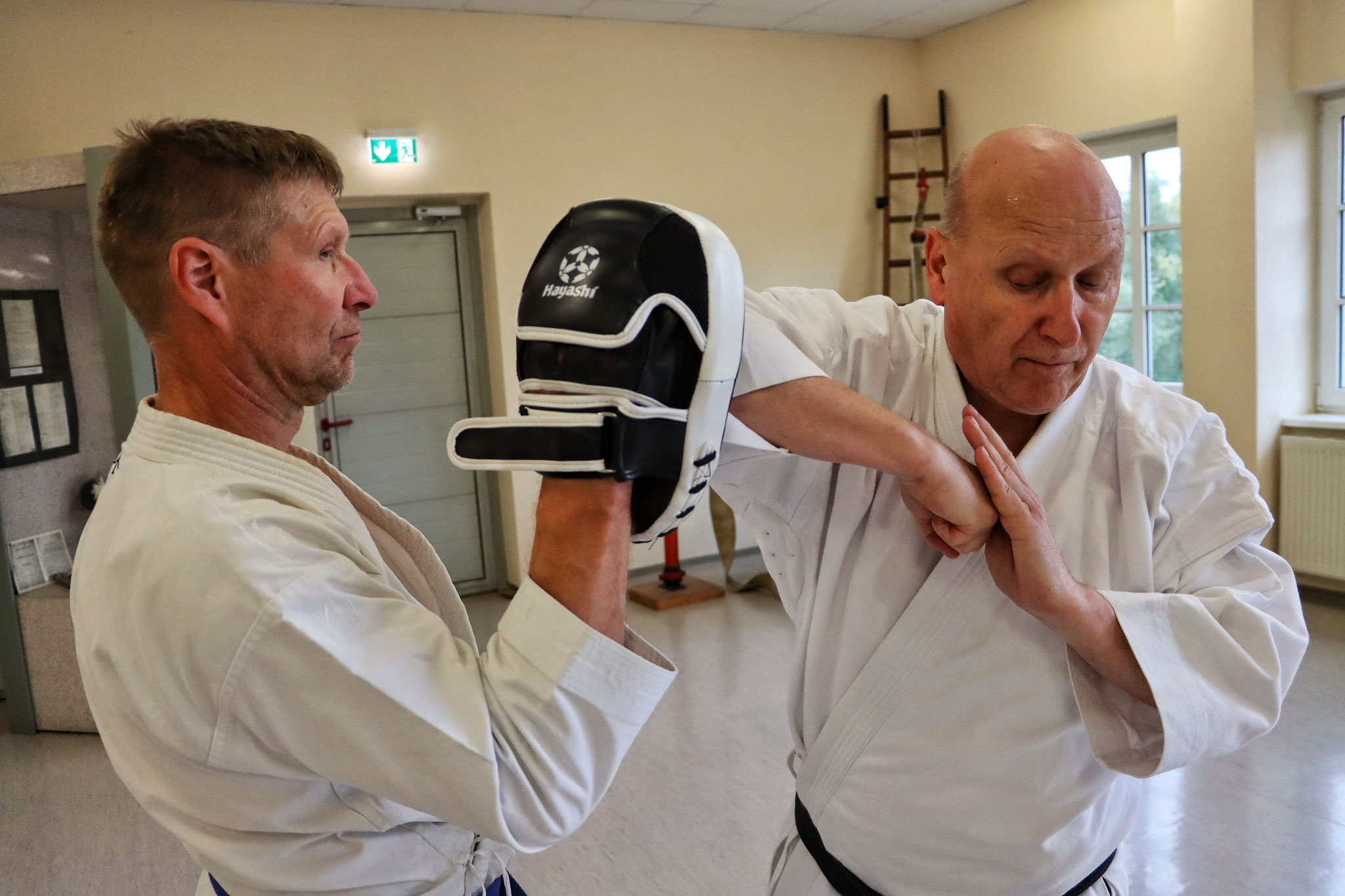 Um im Anschluss den „Kopf freizubekommen“, vermittelte Ronald die aus dem Gjogsul stammende „Hyong Dong Zak Il“, natürlich auch hier wieder auf die Feinheiten und technischen Aspekte eingehend und unter Nutzung von Schlagpolstern. Die Partnerarbeit bzw. die praktische Anwendung stand selbstverständlich wieder im Mittelpunkt.