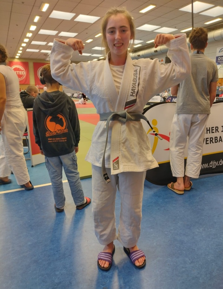 Sie hatte eine Gegnerin vom Leinefelder Ju-Jutsu Verein und musste einen Hin-und Rückkampf gegen sie bestreiten. Die Gegnerin startete aggressiv und offensiv in den Kampf und konnte auch mit einer Haltetechnik punkten. Kamilla konnte sich aus dieser Haltetechnik befreien und kam in den Rücken ihrer Gegnerin, punktete mit mehreren Haltetechniken und gewann diesen Kampf. Der Rückkampf war ausgeglichen und keine der beiden Sportlerinnen konnte Punkte in der regulären Wettkampfzeit einfahren. So wurde weitergekämpft bis die erste Kämpferin eine Halte- oder Aufgabetechnik erringen konnte. Kamilla kam zu einer Back Mount und holte sich mit dieser Haltetechnik den Turniersieg.