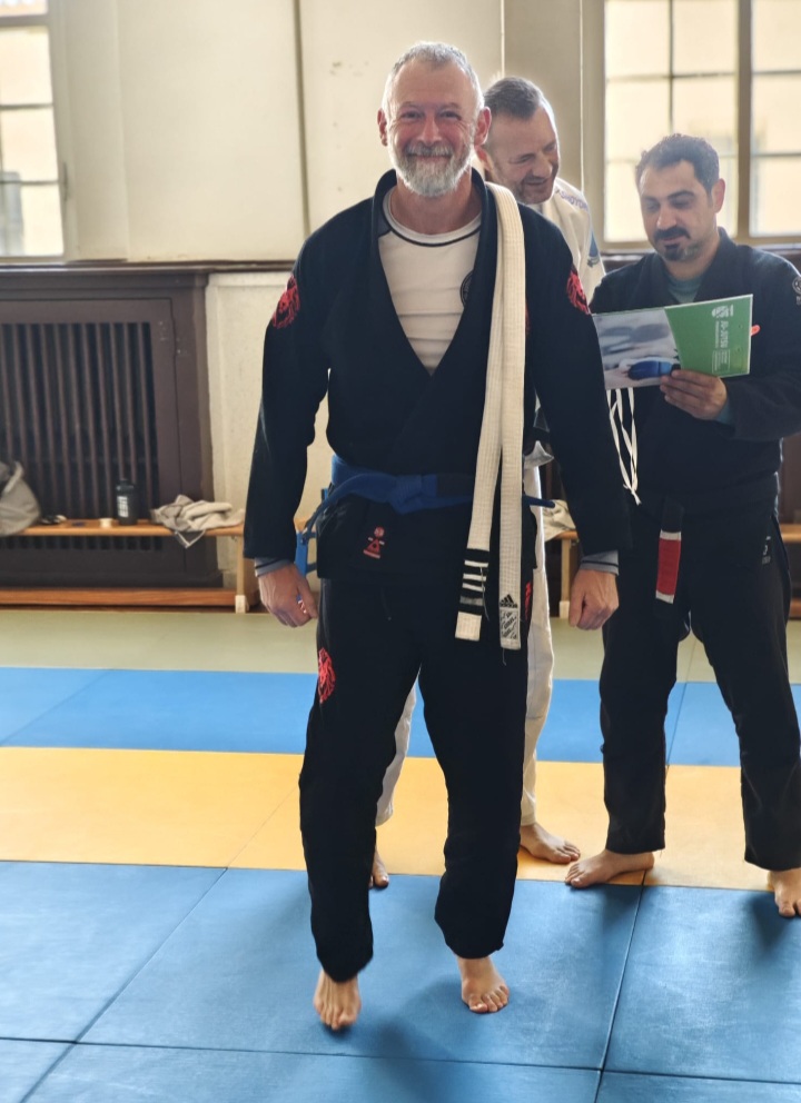 Am 21.09.25 wurde unserem Wettkampftrainer BJJ, Thomas, der Blue Belt BJJ von seinem Meister und Trainer, Marco Leik verliehen. Damit ist er der erste Blue Belt im Verein des OSC Löbau