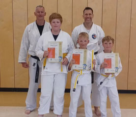 Nach der Verleihung der Ehrennadel in Bronze für Uwe, hieß es noch maximale Leistung zeigen, bei den Kyuprüfungen unserer Kempo Teens. Wir können Finn zum Gelbgurt, Alex und Moritz zum weiß-gelben Gürtel gratulieren.